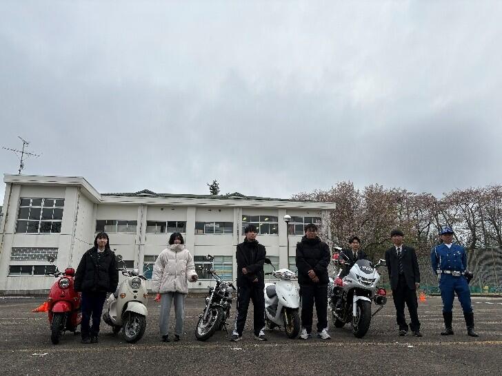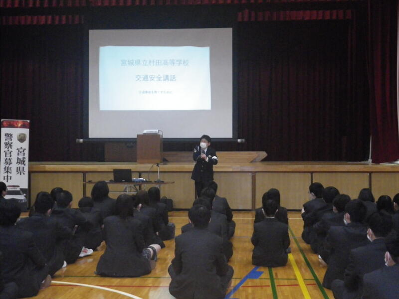 4月15日に全校生徒を対象に「交通安全教室」、バイク通学者を対象とした「バイク通学者運転講習会」を実施いたしました。講師に大河原警察署交通課鈴木様、警務課佐藤様、交通機動隊梶原様をお招きし、講話、実技指導をしていただきました。
