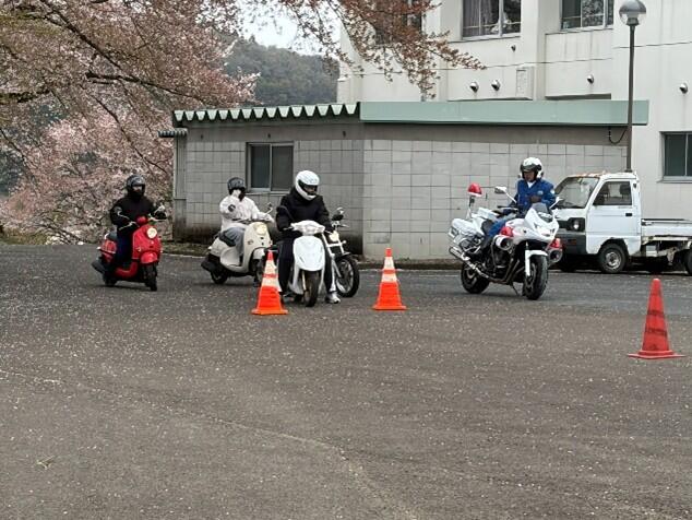 バイク通学者運転講習会では、交通機動隊梶原様に実技披露をしていただき、実技練習を行いました。技術的なアドバイスや実際の事故例を交えた具体的なお話、バイク通学時にあった困りごとの相談にも乗っていただきました。