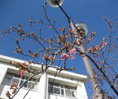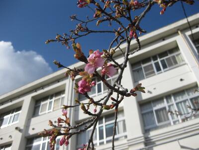 それから一週間後、3月9日には、本校正面階段脇で早咲きの「河津桜」が開花しました。